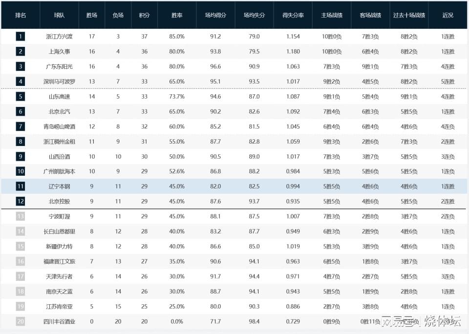 至此,辽宁男篮终结4连败,总成绩改为9胜11负积29分,最新排名攀升到第11位。四川男篮真的是烂到底了,此役之后迎来20连败,如此战绩真是辣眼睛。